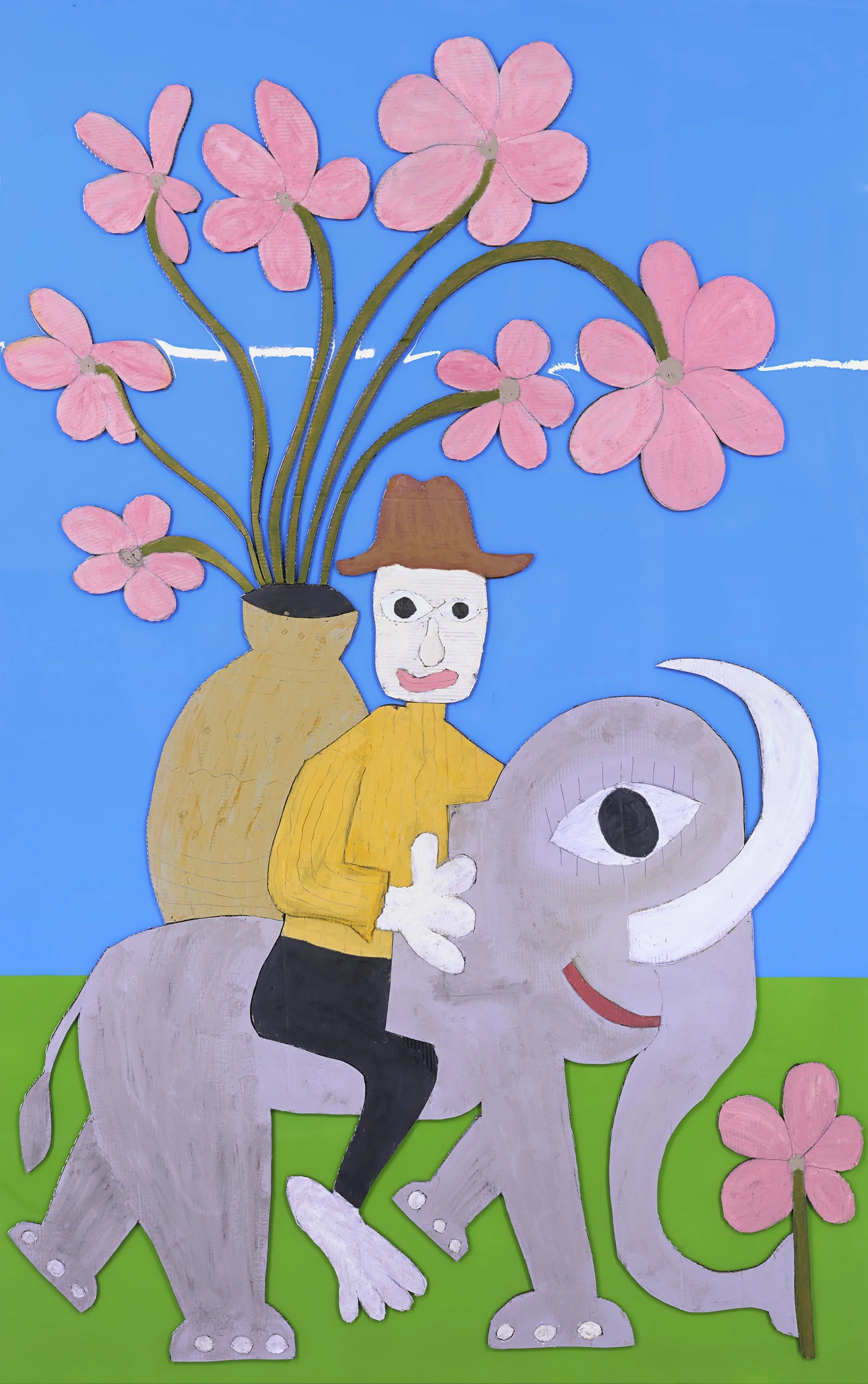 Hadi Falapishi, Going West, 2024. Oil paint, mixed media, cardboard, resin on wood panel. Courtesy of the artist and Andrew Kreps Gallery.