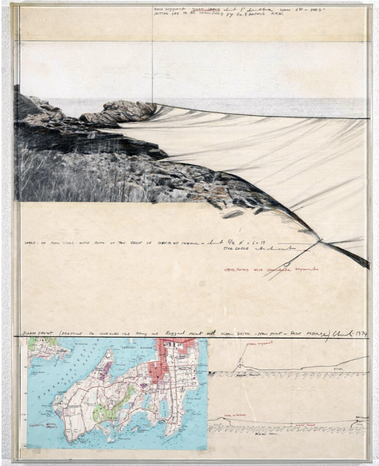 3. Christo, Ocean Front (Project for Covering the Bay at Ragged Point at Ocean Drive - New Port - Fact Passage), 1974, Collage of pencil, wax, crayon, charcoal, ballpoint pen, technical data, map, fabric, staples, Photostat and tape, Gift of the Trust Under the Will of Jeanne-Claude Christo-Javacheff and the Estate of Christo V. Javacheff, Photo: Wolfgang Volz, Copyright 1974 Christo and Jeanne-Claude Foundation, 2023.007.001.